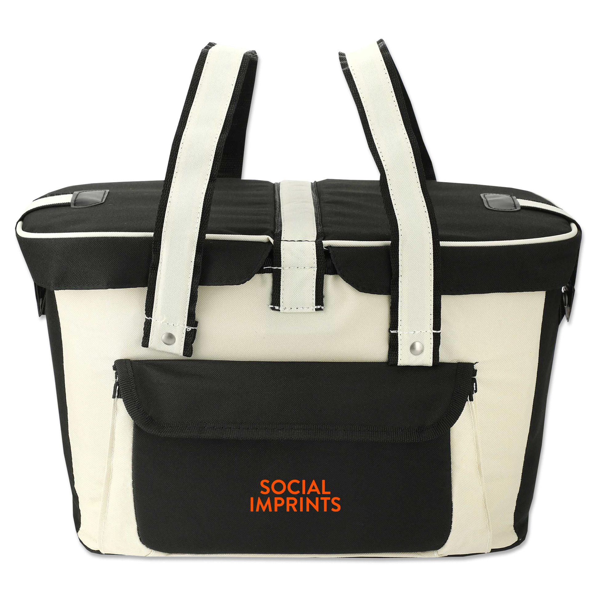 The main compartment of this sturdy 600D PolyCanvas cooler features a unique picnic basket design with dual snap closures. It can hold up to 24 cans, providing plenty of space for your entire group's favorites. For added utility, the Picnic Basket 24 Can Cooler has external accessory pockets, insulated PEVA lining, and a compact 6" handle drop height.